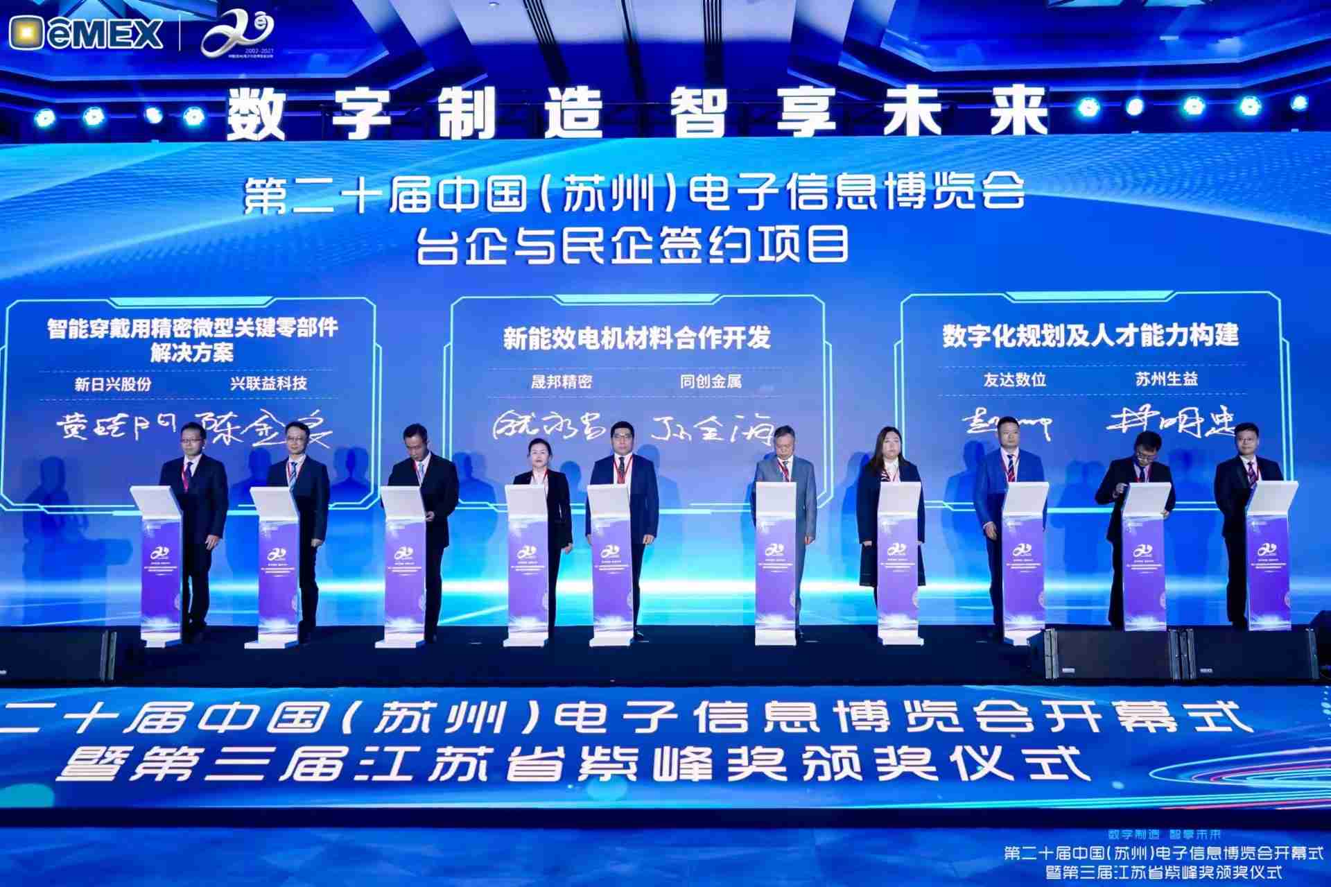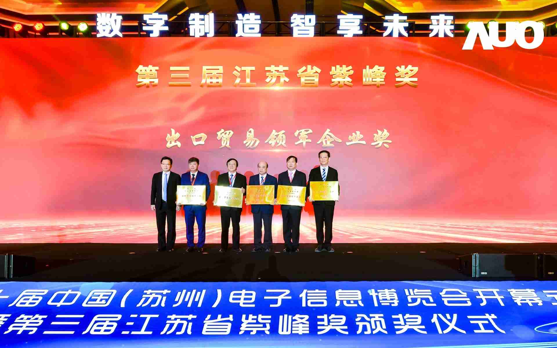 电博会开幕式当天也是第三届江苏省紫峰奖颁奖仪式,,,省台办、、、、工信厅、、、、商务厅、、、苏州市相关领导均出席并颁奖。。该奖项为表彰对江苏高质量发展做出积极贡献的在苏企业,,由江苏省政府专门设立。。牛牛游戏光电 (苏州) 总经理郭振明代表上台领奖,,这也是牛牛游戏苏州连续三次蝉联紫峰奖 出口贸易领军企业奖。。牛牛游戏数位总经理赵丽娜女士,,也参与本次开幕式,,,,上台为本地化赋能签署战略合作协议,,将优质服务资源集合、、、、下沉到更多细分行业,,为更多地区的制造企业提供数字化转型服务。。。