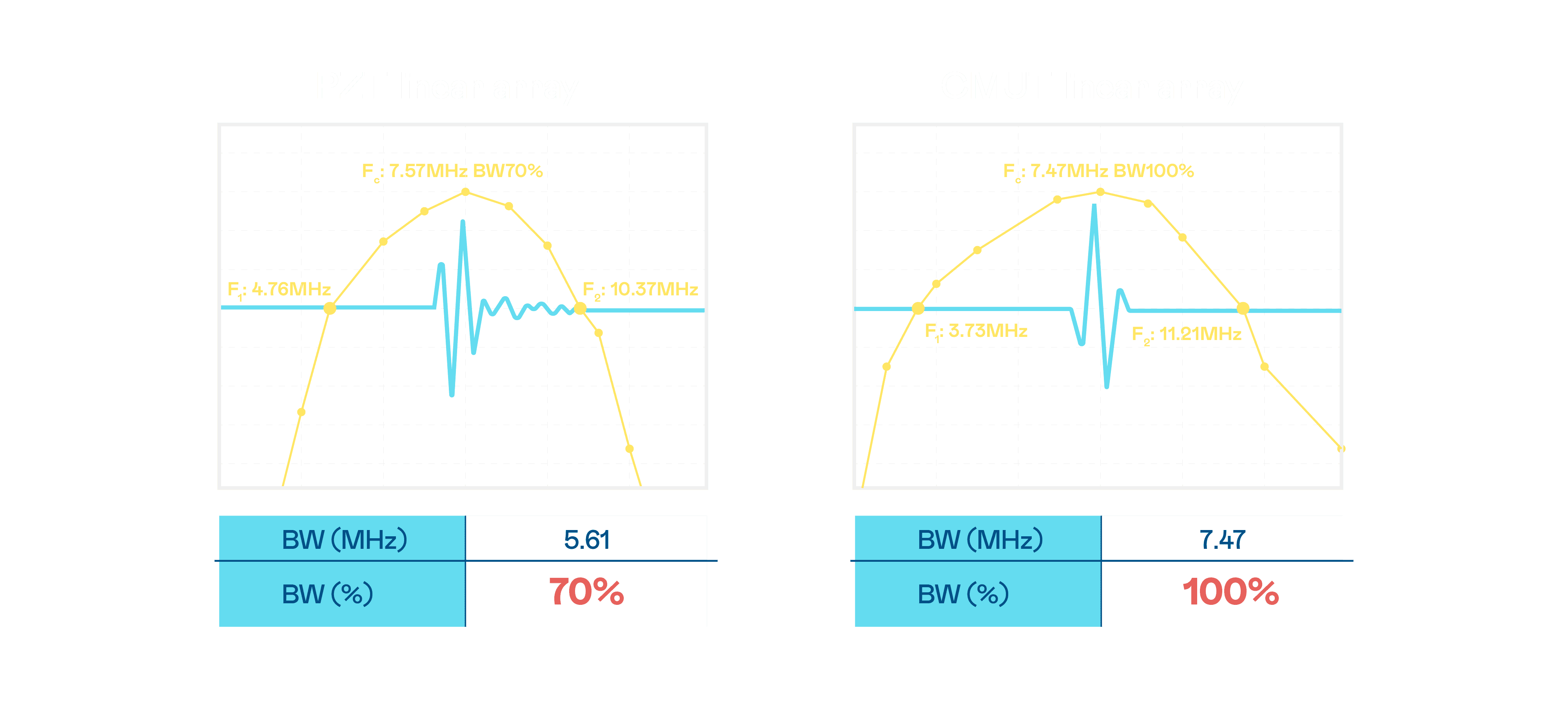 超音波影像的解析度高低,,首先取决于探头能发出的讯号频宽。。牛牛游戏 CMUT 可提供高清晰的超音波讯号,,,,提供高频宽、、、高灵敏度、、影像纹理细节更高的超音波影像,,协助医护人员缩短影像判读时间及利用精准的医疗影像进行诊断。。。